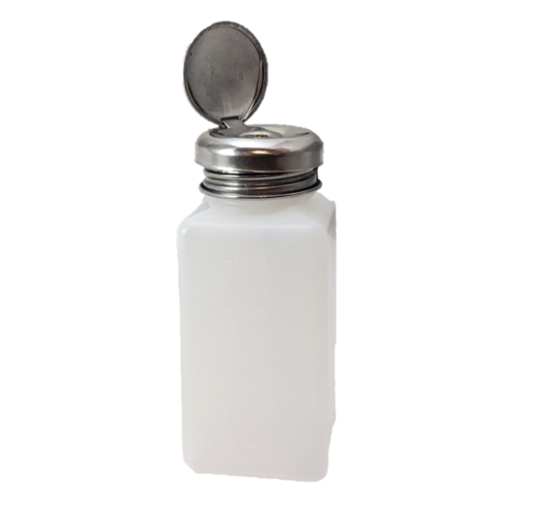 Distributeur en plastique rigide avec couvercle en acier inoxydable utilisé pour l'alcool isopropylique. Dimensions :...