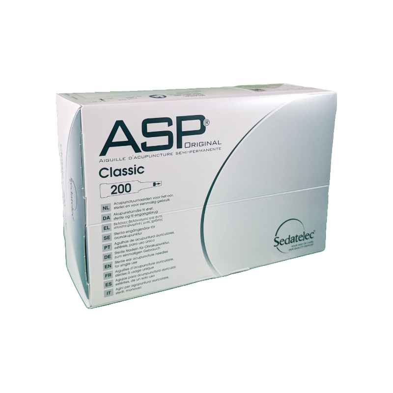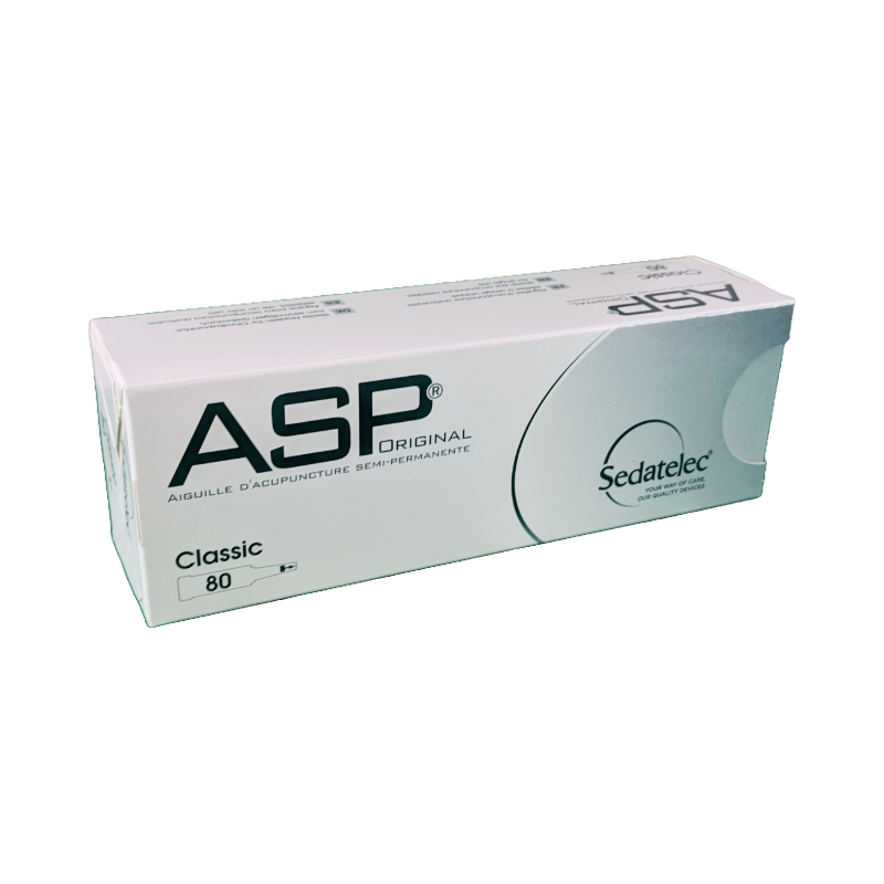 Brochure-ASP-Original-FR Fiche-produit-ASP-Original-FR Les aiguilles d'acupuncture ASP Original, ou Aiguilles Semi-Permanentes, sont utilisées pour la pratique de l'acupuncture auriculaire. Le Dr Paul Nogier a collaboré à leur invention et Sedatelec les commercialise depuis plus de 30 ans. Elles sont présentement le moyen le plus populaire et le plus efficace pour stimuler durablement des points d'acupuncture auriculaire. Les aiguilles d'acupuncture ASP Original Classic sont en acier inoxydable sans nickel. Elles viennent avec un injecteur en plastique avec aimant qui permet au praticien d'implanter l'aiguille facilement et précisément sur le point à traiter. Il permet aussi d'éviter toute contamination de l'aiguille lors de la pose. Une fois l'aiguille mise en place, le praticien peut la protéger avec une pastille adhésive. L'aiguille agit tant qu'elle est en place, et ce, grâce à l'aimant logé sur l'injecteur. Cet aimant permet d'induire un champ magnétique dans l'aiguille implantée. C'est la forme de ces petites aiguilles qui leur confère une efficacité exceptionnelle. La fabrication des aiguilles d'acupuncture ASP Original Classic a lieu en salle blanche. Leur stérilisation se fait par rayonnement gamma. Boîte de 80 ou de 200 aiguilles en emballages-coques unitaires. Stériles, à usage unique. Les aiguilles ASP sont aussi offertes en versions Or et Titanium. Les praticiens choisiront l’une ou l’autre en fonction du niveau de réactivité de leur patient et de leur propre expérience avec les 3 métaux. Magasinez les autres aiguilles d’acupuncture ASP