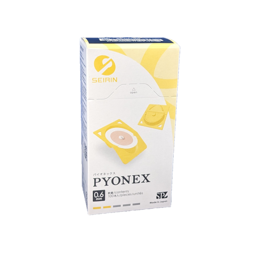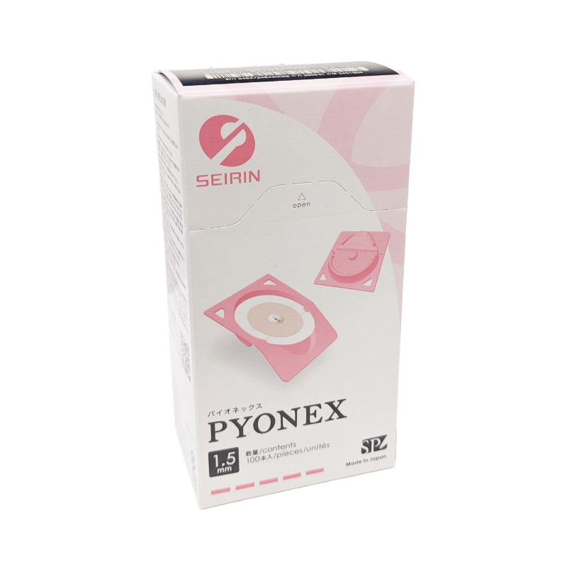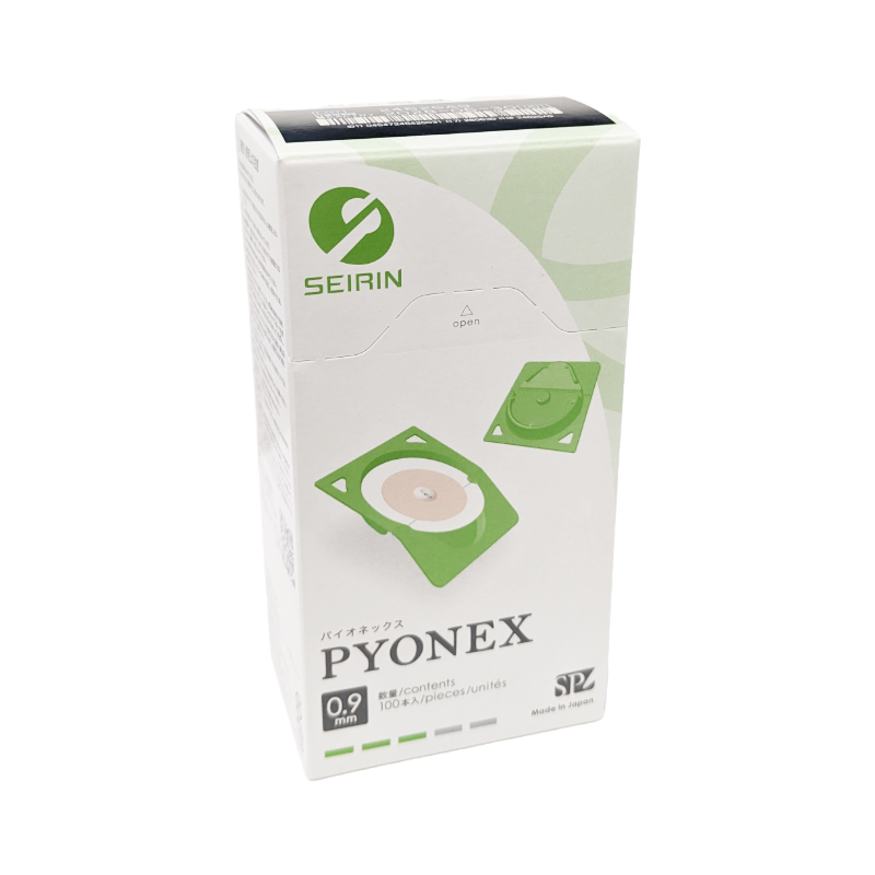 Les aiguilles d'acupuncture pression Pyonex™ s'inscrivent dans la tradition des aiguilles pression sans douleur et sans stress de SEIRIN. Le boîtier et la gaine en plastique sont brevetés. Ils permettent au praticien d'insérer l'aiguille sans toucher le bout de l'aiguille ou la surface du ruban adhésif micropore. Cet adhésif hypoallergène sans latex permet à la peau de respirer pendant le traitement. Grâce à l'insertion en douceur de SEIRIN, le résultat est une expérience agréable et sans douleur pour votre patient. Boîtes de 100 aiguilles à pression individuelles, jetables.