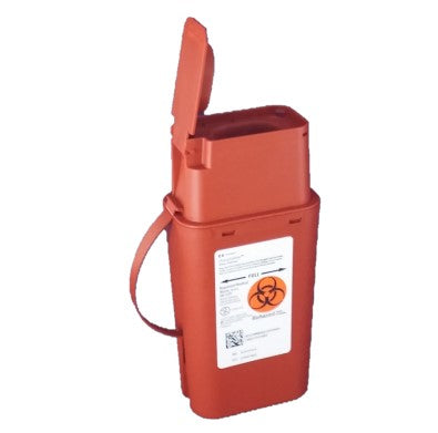 Contenant collecteur SharpSafety pour déchets biomédicaux et aiguilles souillées.
