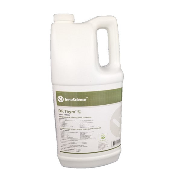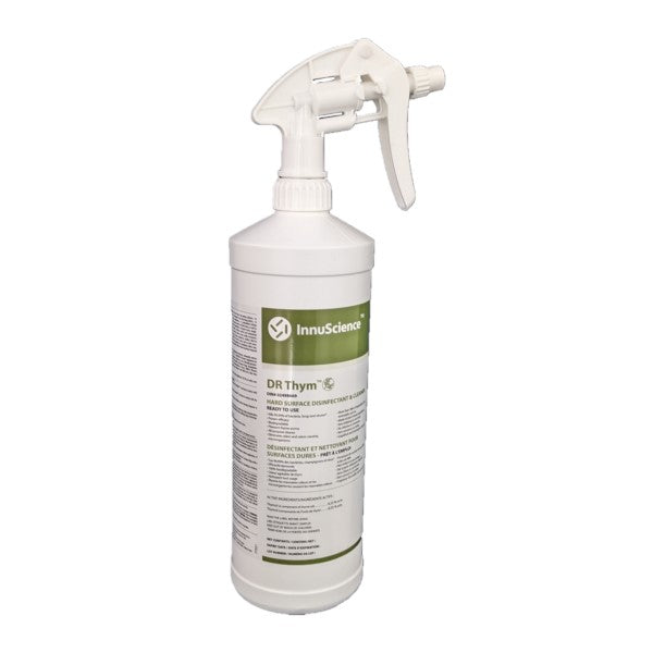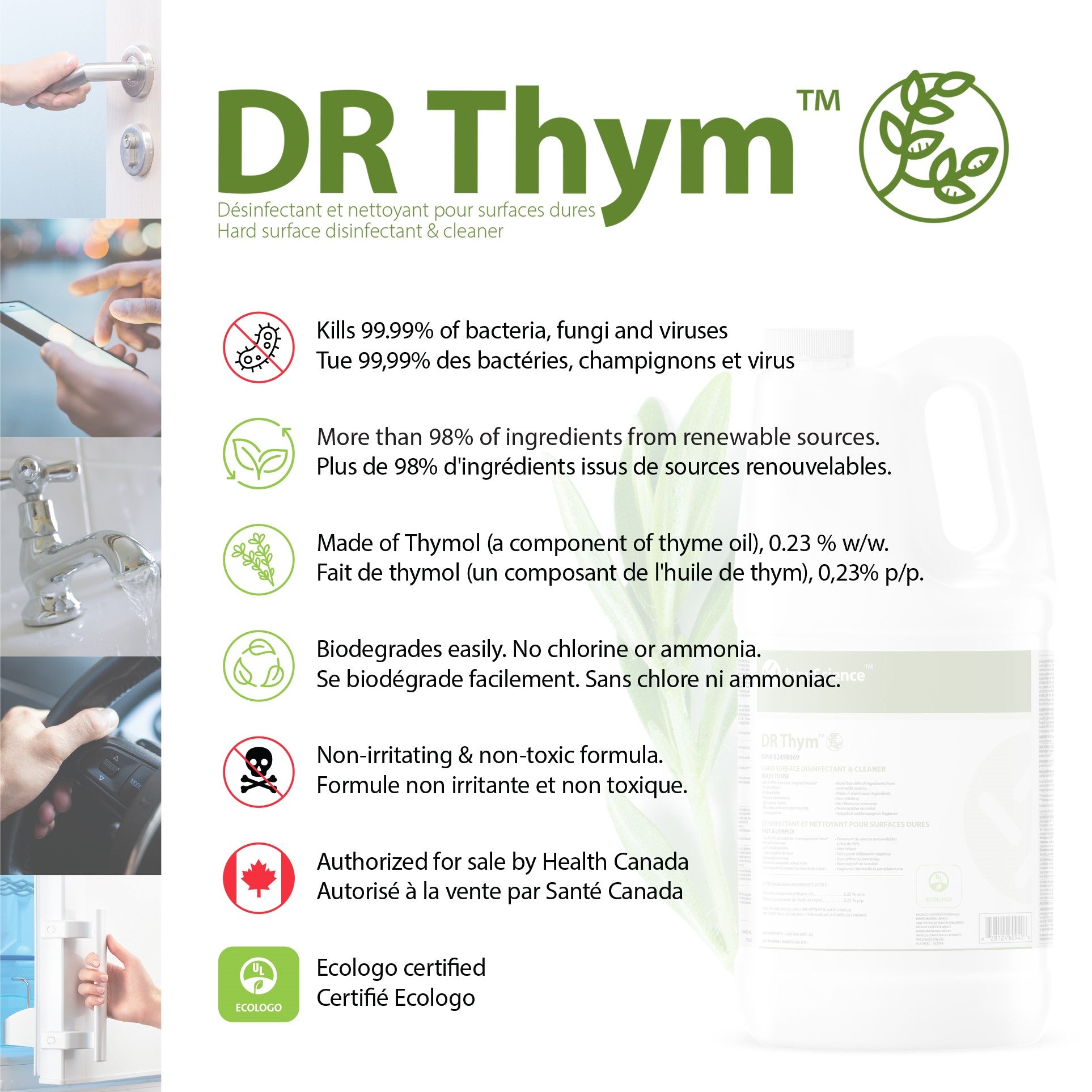 Le DR Thym™ est un mélange actif à base d’huile essentielle spécialement sélectionné pour obtenir une grande efficacité de désinfection. DR Thym™ est idéal pour désinfecter les surfaces dures non-poreuses (surfaces émaillées, bois, métal, ciment, plastique, PVC, miroir, vitre) telles que les surfaces de travail, planchers, comptoirs, éviers, armoires, douches, planches à découper, sièges de toilette, poubelles, poignées de portes, tables, jouets, téléphones, équipement sportifs, tables d’examen, chaises de patients, bureaux ou toutes autres surfaces sur lesquelles bactéries, champignons et virus peuvent survivre ou se multiplier.