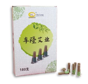 Boîte de 180 mini bâtons de moxa PUR troués, avec un collant et du carton à la base.
