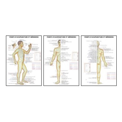 Ensemble de 3 planches en carton épais plastifié montrant les points d'acupuncture et les méridiens, avec indications pathologiques :